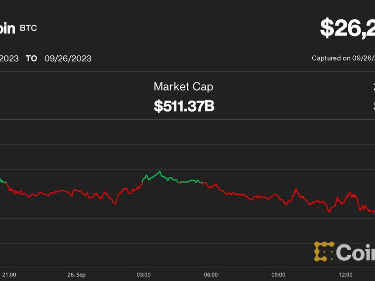 火曜日、ビットコイン(BTC)の価格は、金融市場全体で長期間にわたる高金利の考えが定着する中、26,200ドルで圧力下にありました。広範なCoinDesk Market Index(CMI)は0.6%下落し、ビットコインの下落をわずかに下回っています。